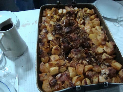 Passámos ao cabrito assado,com batatinhas e arroz de miudos (o tal tema do confrade João Moura).Claro que o cabrito,tratado na assadeira pelo confrade Rui,bem como o tacho de arroz de miudos,deram para o debate durante algumas horas e,por unanimidade e aclamação,foi aprovado como tema superior.Estava de estalo!